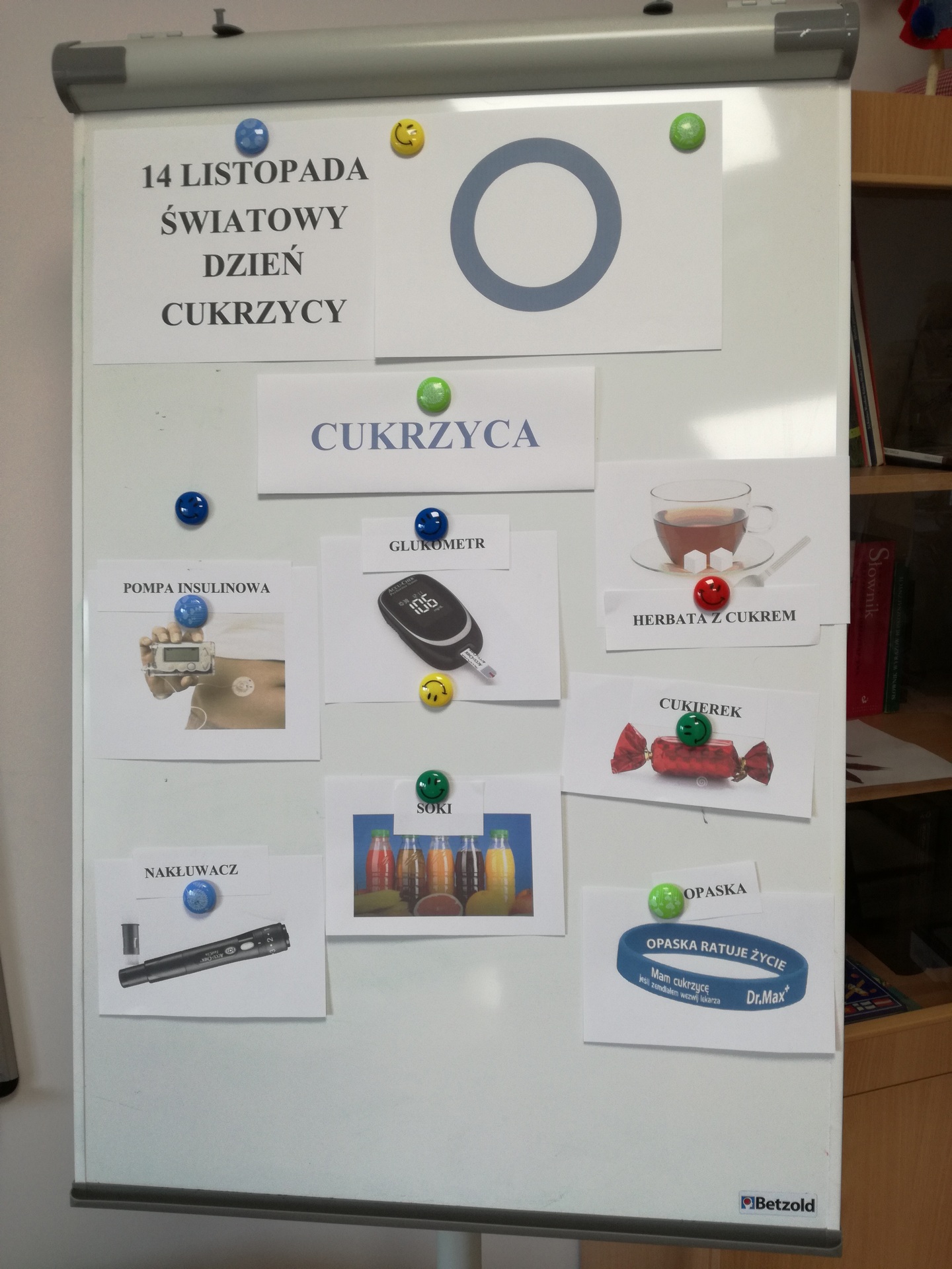 Natomiast dnia 14 listopada z okazji Światowego Dnia Cukrzycy poruszyliśmy sprawy zazwyczaj niezbyt dobrze znane. Omówiliśmy dolegliwości ludzi chorych na cukrzycę, sposób leczenia tej trudnej choroby, a także rutynowe czynności , o których muszą pamiętać  chorzy oraz osoby z ich najbliższego otoczenia. Dla niektórych członków naszej społeczności szkolnej był to temat związany z codziennością, dla innych zagadnienie nowe i trudne. Na pewno jednak warto było się nad nim zastanowić!