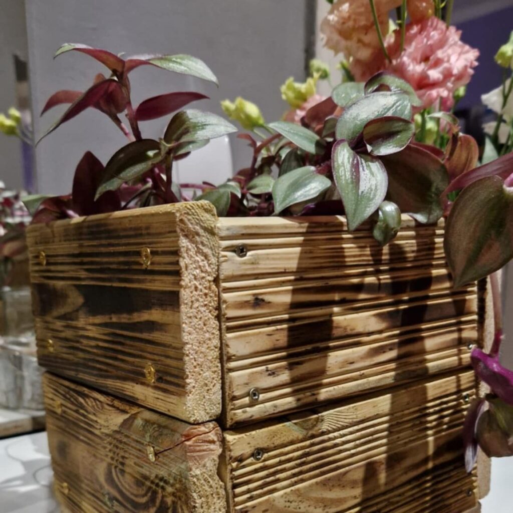 Chłopcy wręczyli dziewczynkom doniczki z drewna, w które posadzili młode roślinki.