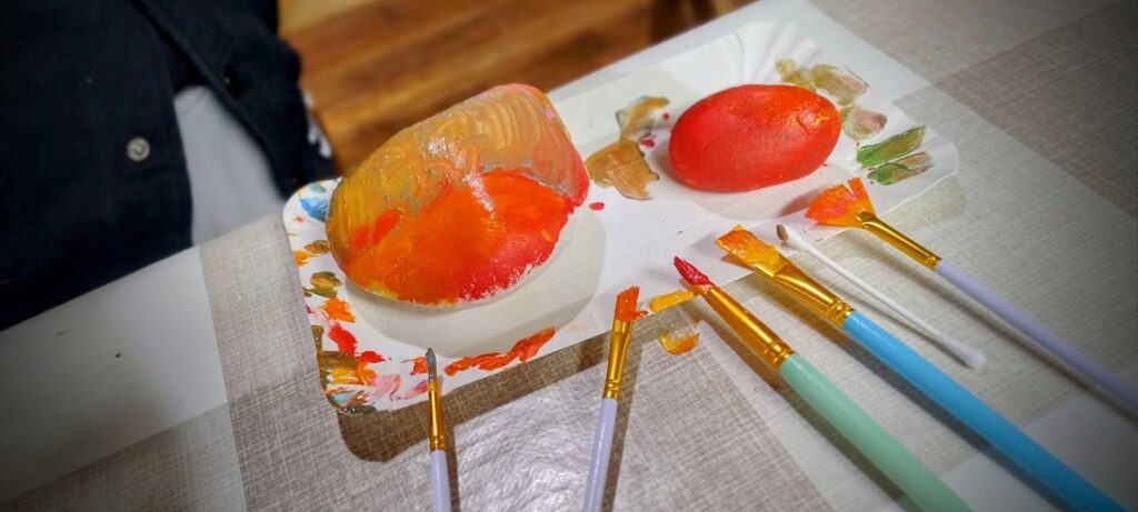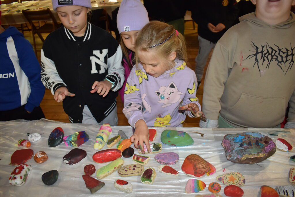 Z okazji Dnia Chłopca wszyscy nasi uczniowie uczestniczyli w warsztatach malowania kamieni. Prowadziła je pani Agnieszka Jęcz – nie tylko nauczycielka, plastyczka, ale także osoba o wielu zainteresowaniach, zaangażowana w swoją twórczą i edukacyjną pracę. Razem stworzyliśmy tyle kamiennych obrazów, że nie tylko uczniowie się nimi nacieszyli. Sporo powędrowało jako dekoracje do domów. Starczyło jednak na prezenty dla pani dyrektor i wystawę poplenerową na szkolnym trawniku. Ach, jak tam teraz kolorowo…